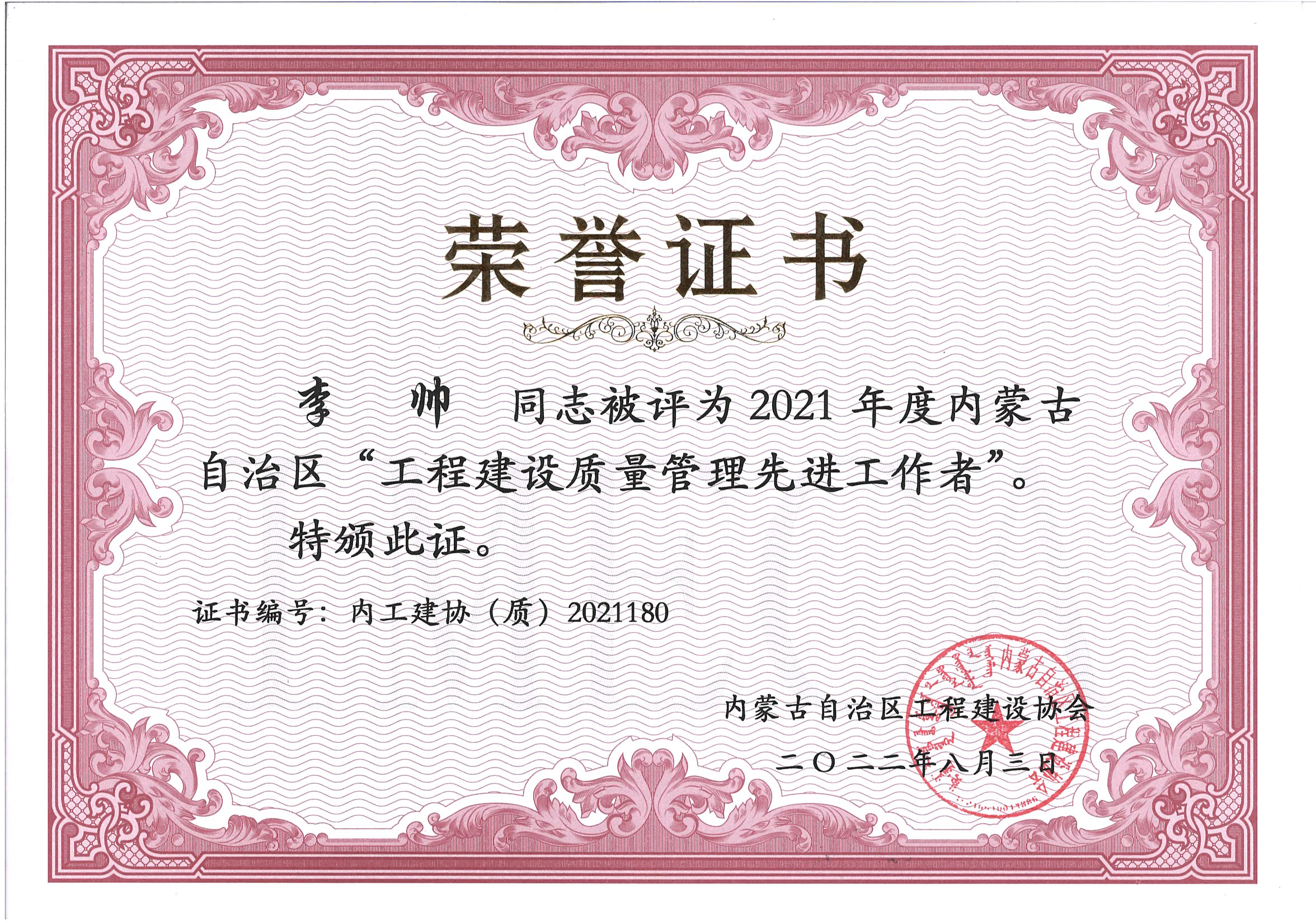 2021年度內(nèi)蒙古自治區(qū)工程建設(shè)質(zhì)量管理先進(jìn)工作者--李帥