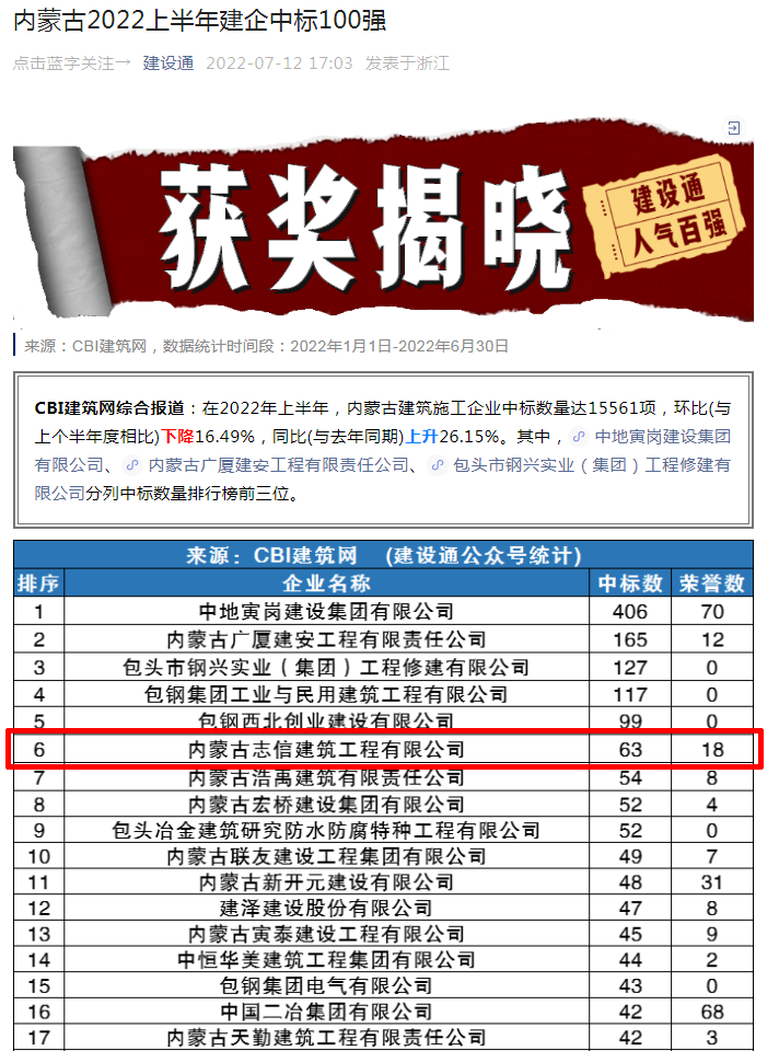 2022年上半年,雖經(jīng)歷了疫情的影響,但是我公司在做好疫情防控的同時精準有序復(fù)工復(fù)產(chǎn),堅定信心、攻堅克難,堅決克服疫情影響,努力完成全年目標(biāo)任務(wù)。上半年中標(biāo)數(shù)量63,獲得榮譽18項,喜獲內(nèi)蒙古2022上半年建企中標(biāo)百強企業(yè)“第六名”,呼和浩特2022上半年建企中標(biāo)百強企業(yè)“第一名”,下半年,還要繼續(xù)努力,凝心聚力促生產(chǎn),喜迎二十大,奮進新征程!